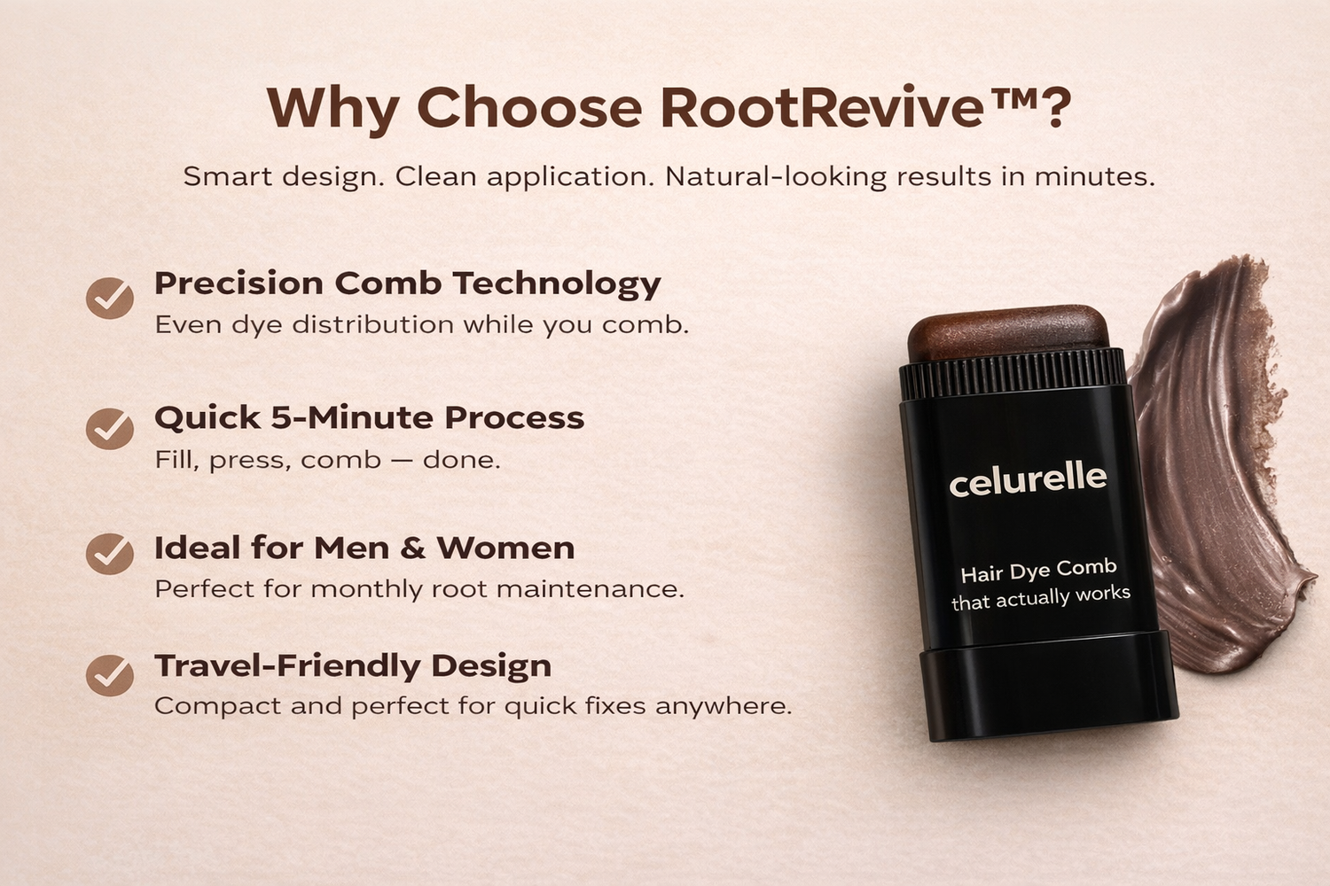 With RootRevive™ Instant Dye Comb, the applicator and comb are built into one smart tool. Just fill, press, and glide through your roots for clean, even coverage in minutes.